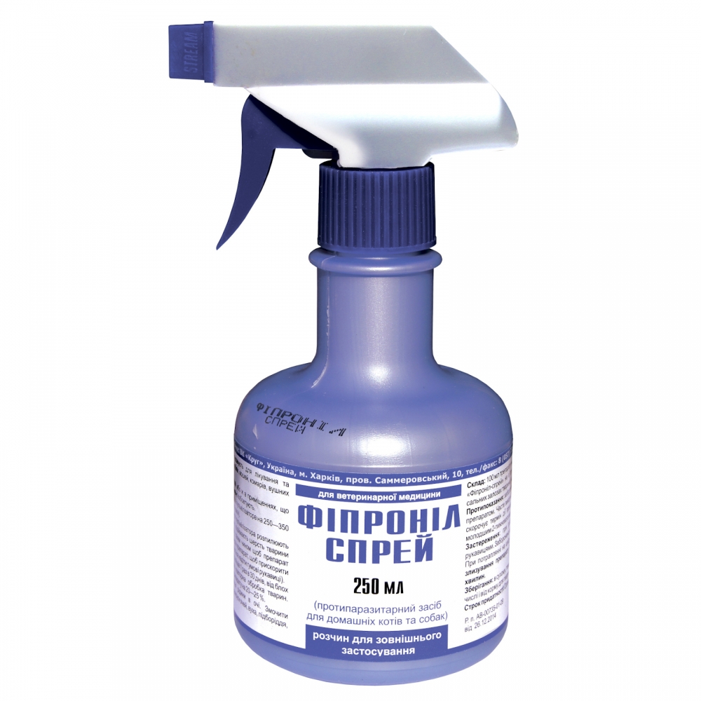 Спрей ФІПРОНІЛ (250 мл.) містить активну речовину, фіпроніл – 0,28-0,3%.