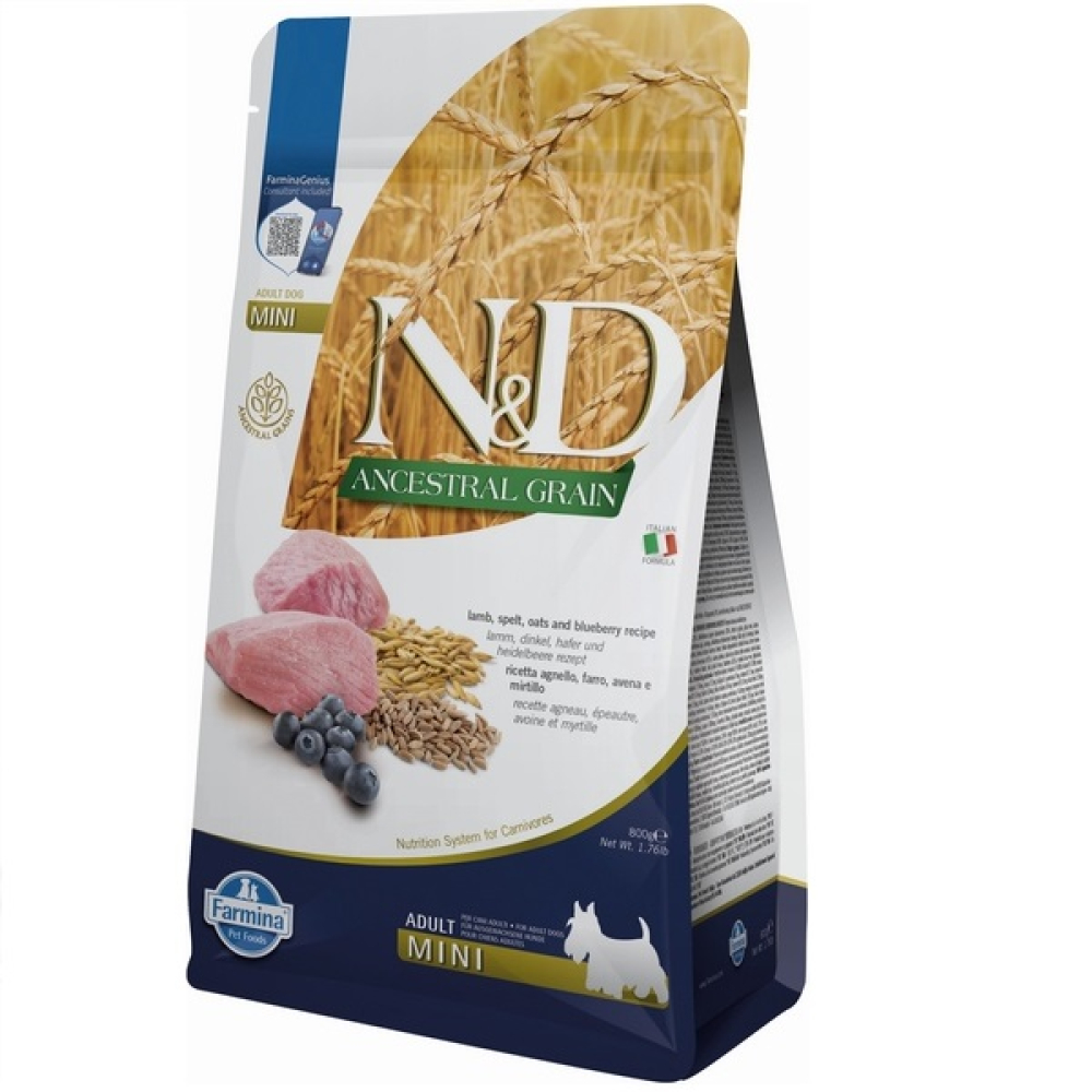 Сухий низькозерновий корм для дорослих собак малих порід Farmina N&D з ягням та чорницею 800г багатий тваринним білком, фруктами, овочами, мінералами і містить невелику кількість злаків.