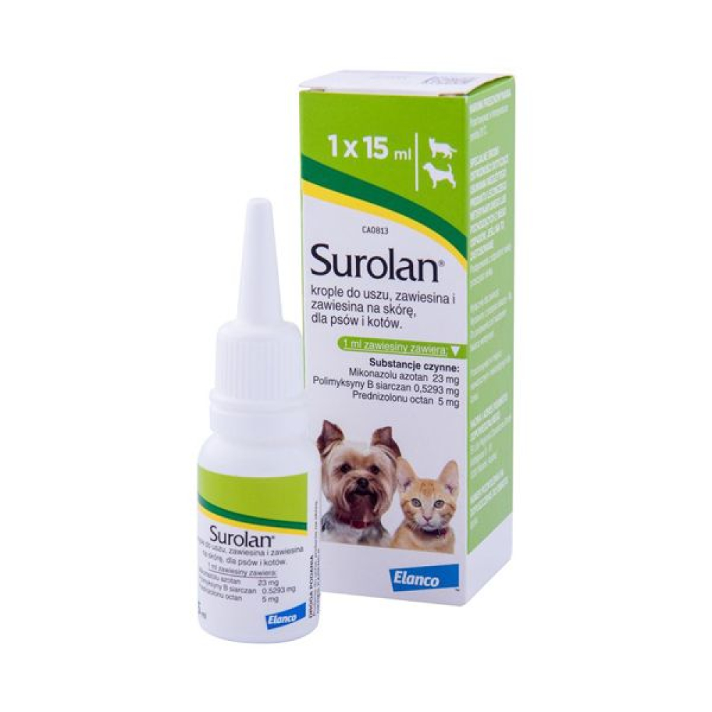 Застосовують Суролан для лікування собак та котів при зовнішньому отиті, дерматиті шкіри, що спричинені патогенними грибками (Microsporum spp., Trichophyton spp., Candida spp., Malassezia pachydermatis), грампозитивними та грамнегативними бактеріями (,Staphylococcus spp., Streptococcus spp., Pseudomonas spp., Escherichia coli), кліщами (Otodectes cynotis).