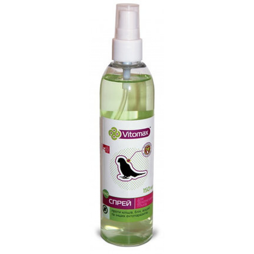 Еко спрей ТМ Vitomax являє собою рідину ніжно-зеленого кольору, з приємним ароматом. Призначений він для відлякування бліх, кліщів та вошей у птахів. Також спрей має гігієнічну та заспокійливу дію - знімає подразнення, усуває свербіж.