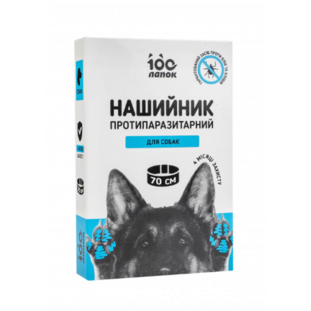 Нашийник 100 Лапок являє собою вузьку полімерну стрічку синього кольору, з петлями для фіксації. Призначений для знищення бліх, кліщів, вошей та волосоїдів, а також для профілактики та лікування захворювань, викликаних цими паразитами.