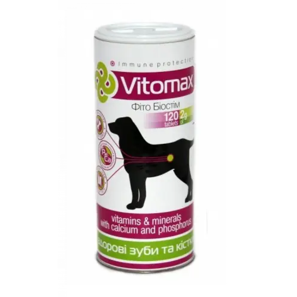 Здорові зуби і кістки важливі не тільки для активних собак. При нестачі кальцію або фосфору в організмі вихованця відбуваються різні порушення, що супроводжуються дискомфортом, захворюваннями і травмами. На жаль, в повсякденній їжі собаки рідко отримують дані мінерали в достатній кількості, що обумовлює необхідність впровадження спеціальних харчових добавок. Вітамінно-мінеральний комплекс ТМ Vitomax "Для зубів і кісток собак з кальцієм і фосфором" дозволяє надати собаці всі необхідні речовини для правильної роботи зубів і кісток. Даний препарат може застосовуватися і як профілактичний, і як лікувальний засіб.